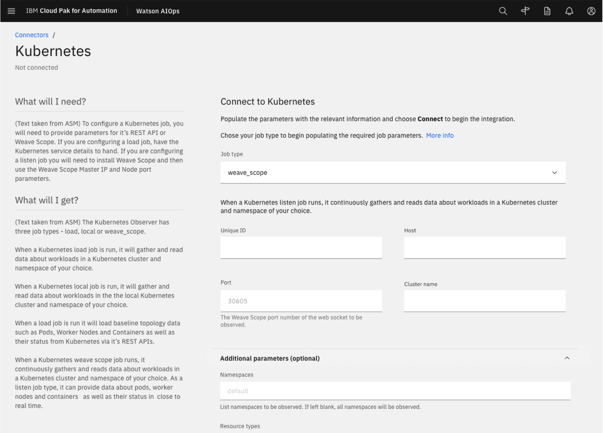 The side panel concept started with some information in one of the existing products we were starting to fold in to Cloud Pak for Watson AIOps. There was a somewhat buried blurb in the tool configuration forms that detailed “what should I give” and “what will I get” by connecting to different tools to bring in data. The concept was good but I thought had one glaring issue: the information seemed to come a little late in the game. I thought it would be much more helpful if users could get access to these details prior to landing on the actual connection form so they’d have time to gather the necessary information for a smoother set up. In the as-is, the user needed to select the tool first and then they would see these details but I pushed for moving it out of the connection form entirely and placing it earlier in the flow. We somehow needed to tie it to the catalog page where they were deciding which tools they wanted to connect.