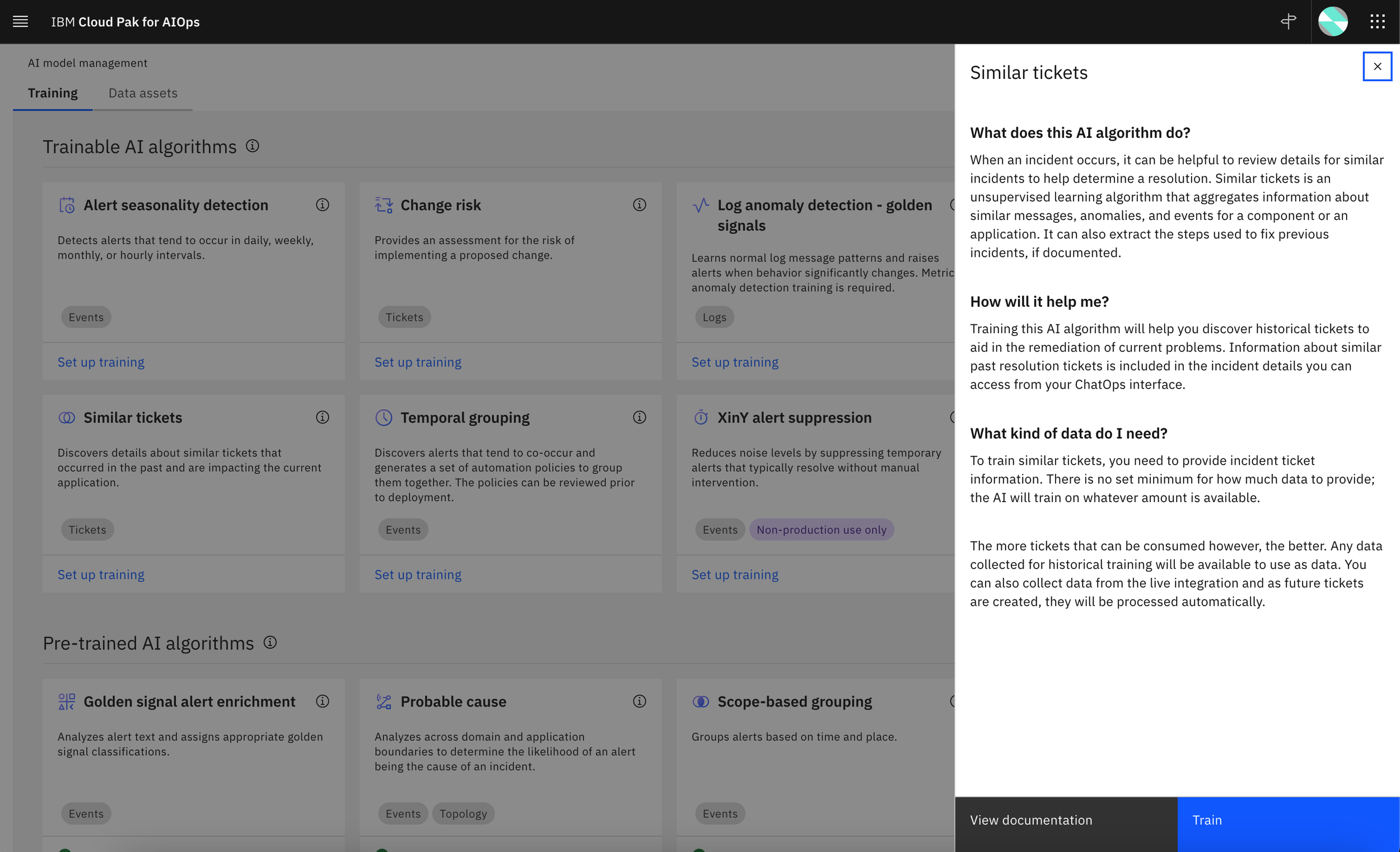 Side panel information to help users decide if they want to train the Similar tickets algorithm in AI model management: