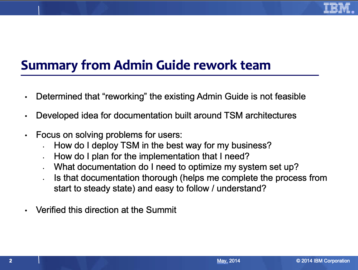 When I joined the Tivoli Storage Manager team as a tech writer, our Administrator’s Guide was close to 1400 pages and those were in the days when manuals were still being printed. The volume and number of topics grew every year and without time to revisit old information, the guide ballooned to an overgrown dump of information.
