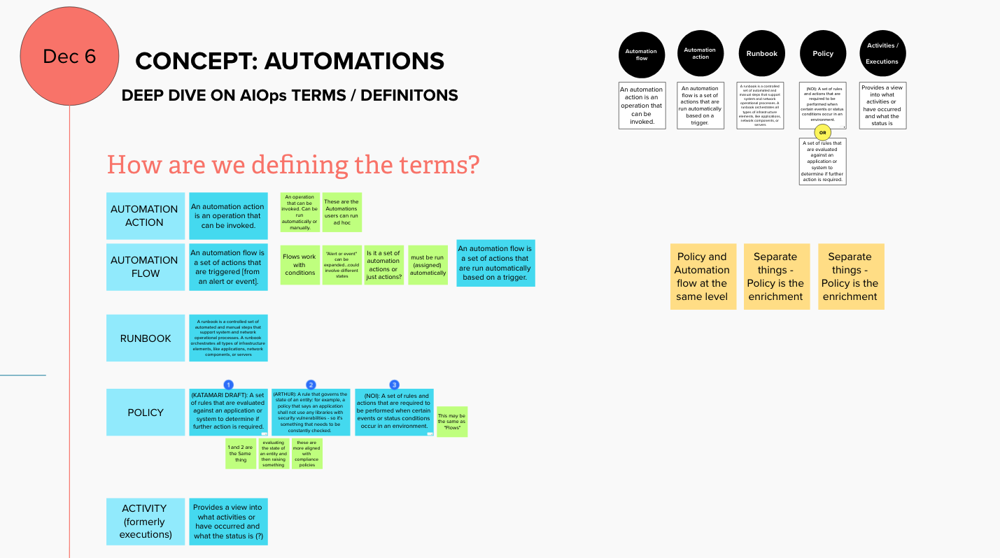 Under the umbrella of this work group, another terminology challenge arose when our team started looking to change the term “policies" in Cloud Pak for AIOps. Some of the other Paks were using “workflows” and “automations” and there was a lot of overlap of terms in this space both within and outside of products. I started digging in to try and understand whether this was simply a name change or if there were two different concepts we were trying to explain. I organized several meetings with our cross discipline (xBox) teams and wider affected Pak teams. Our UX design lead facilitated an OOUX (Object Oriented UX) workshop to try and help us align.
