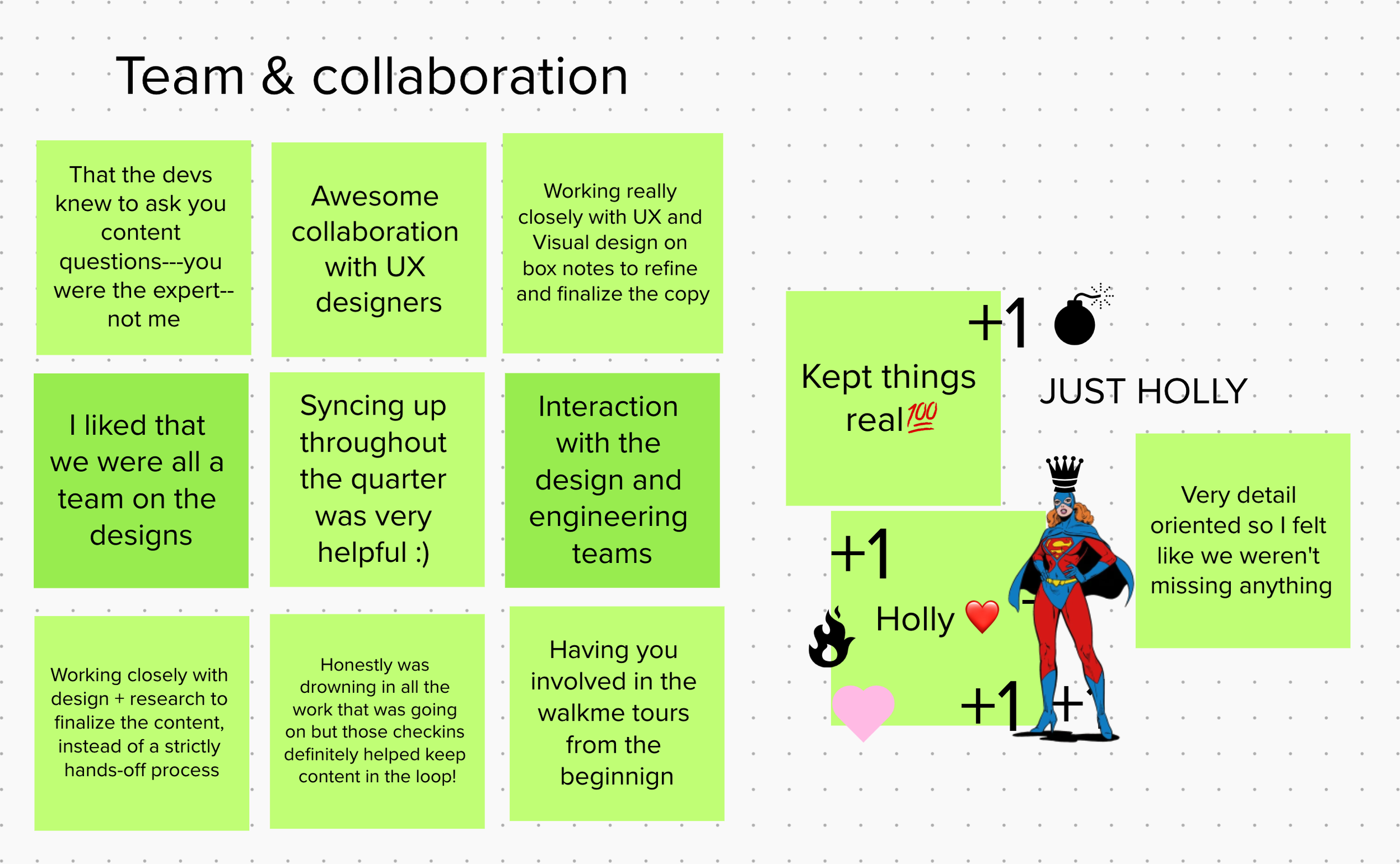 Be flexible when working with different designers and preferences (review in Mural vs. Figma, provide input vs. writing content from scratch).