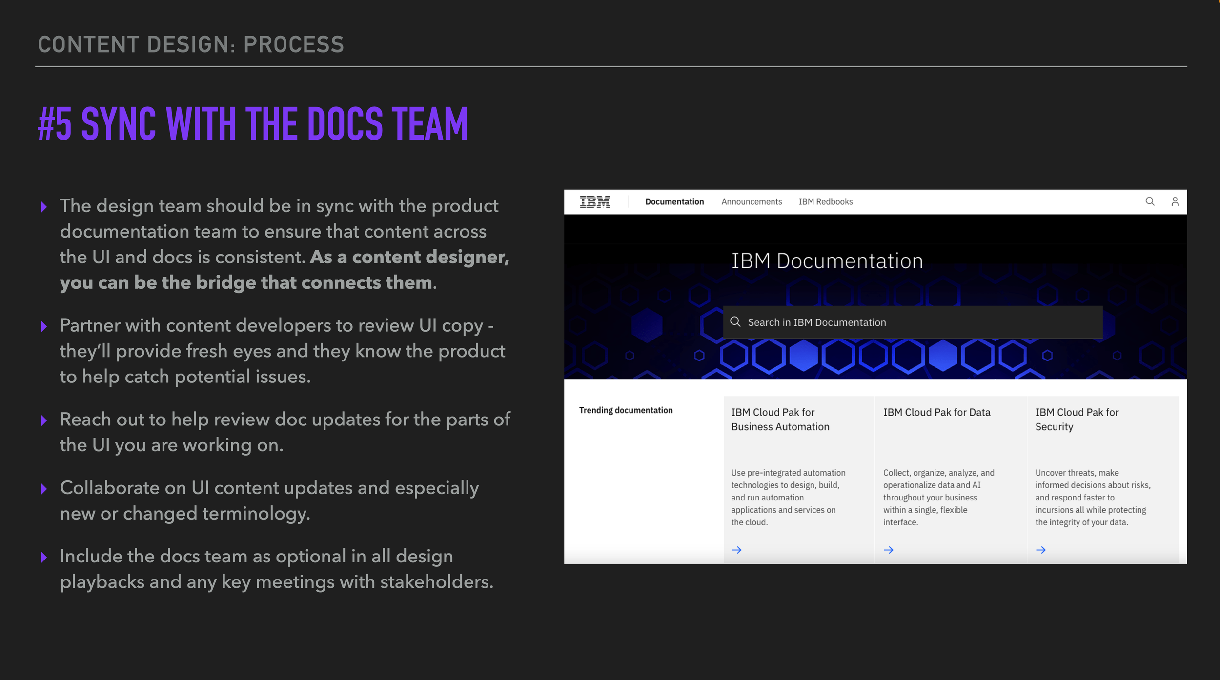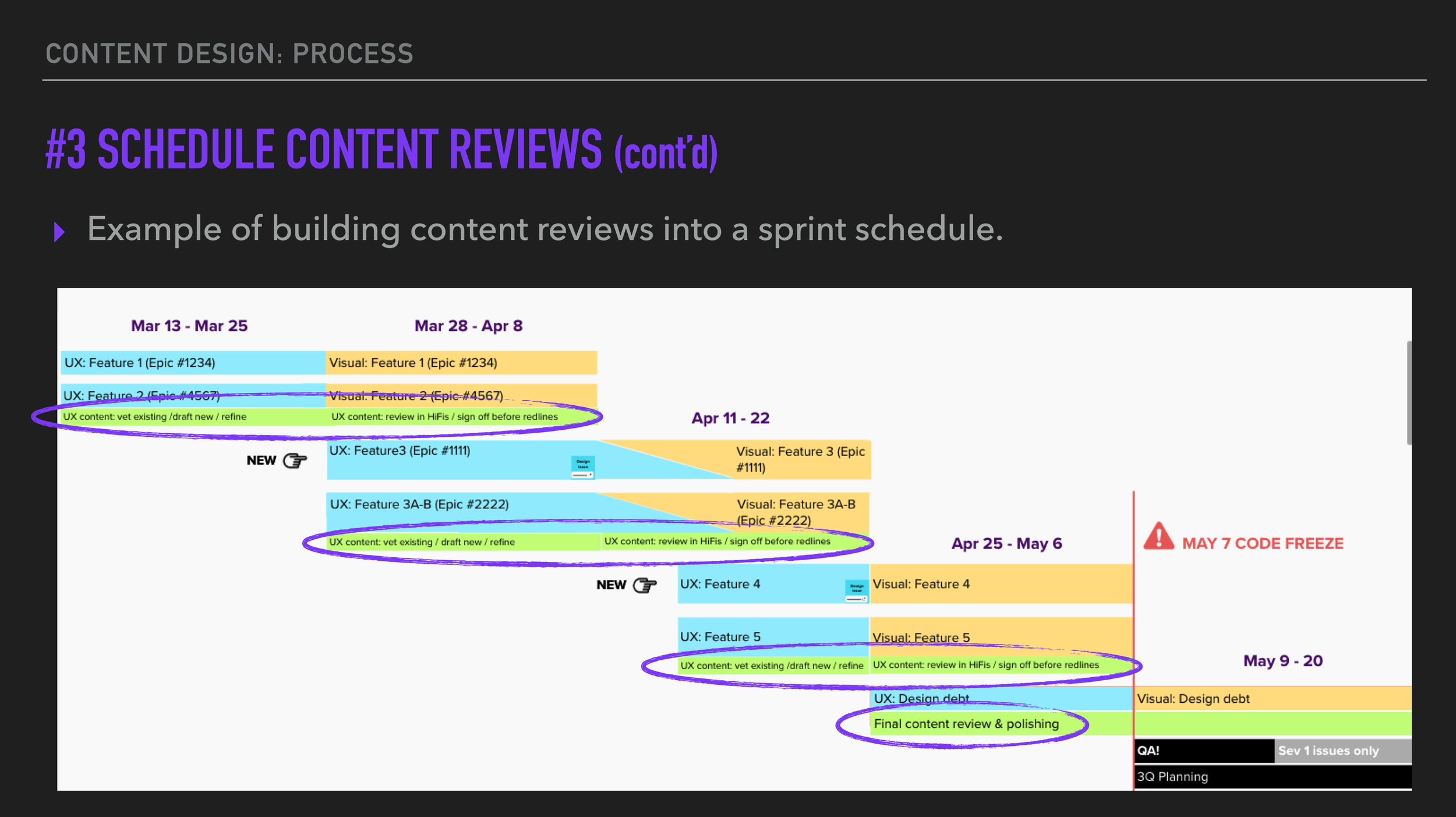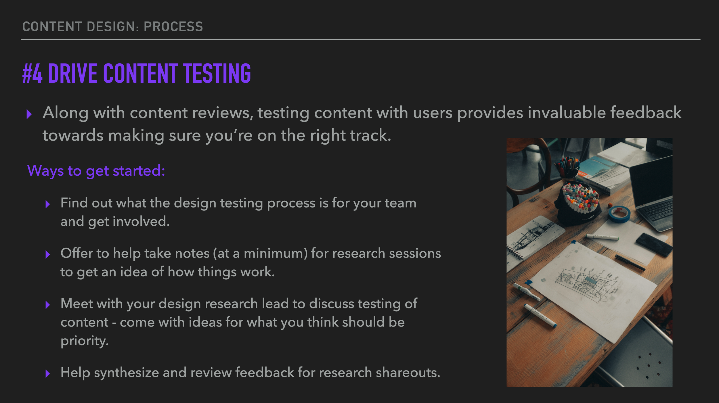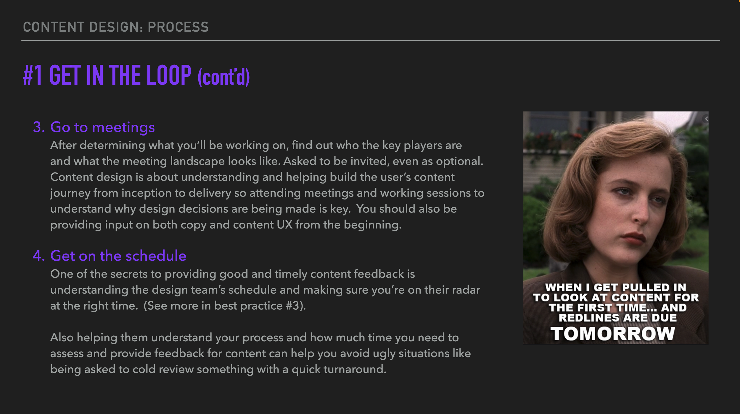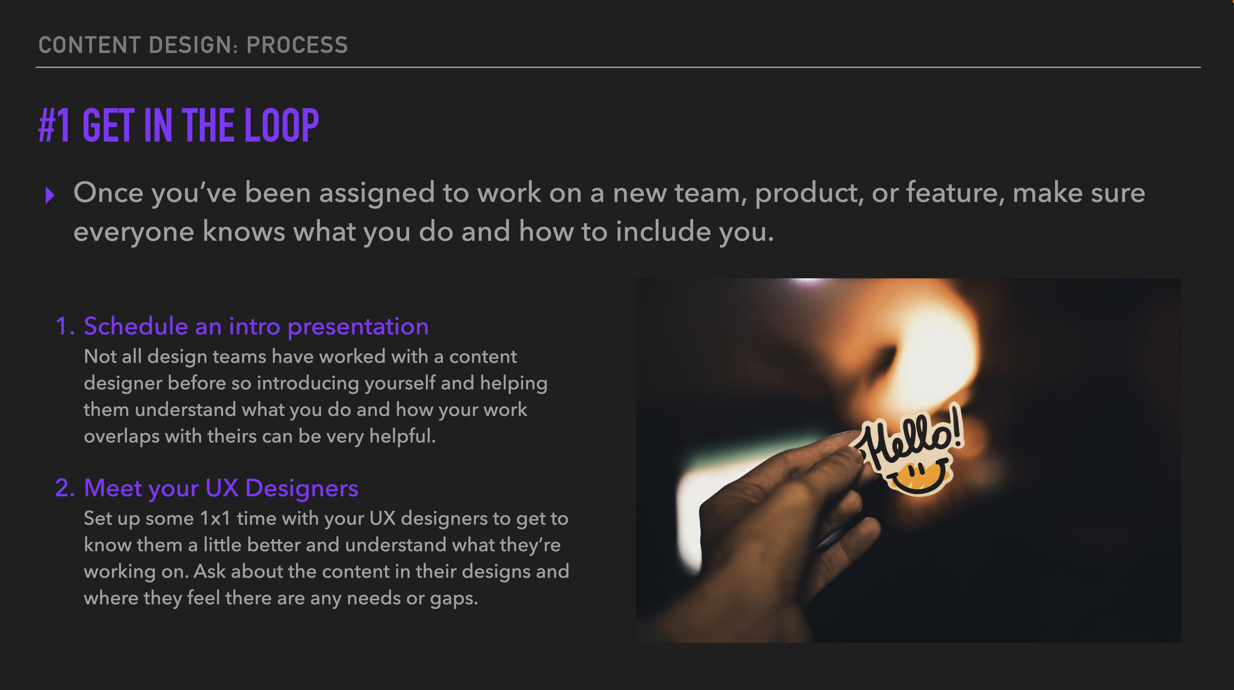 Part of a Role and Process deck I put together to help other content designers based on practices I found successful: