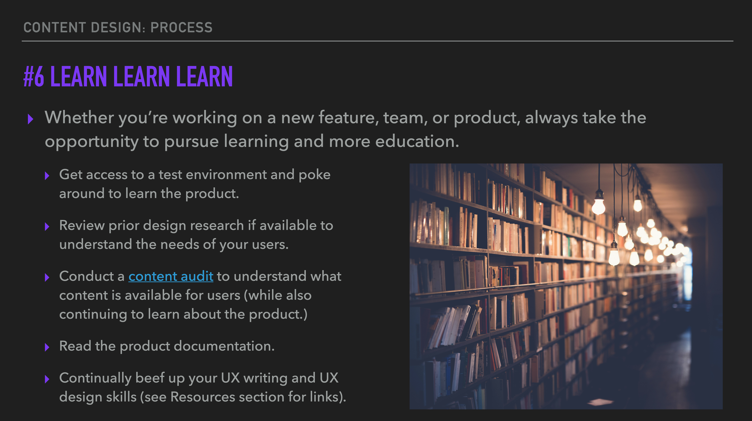 Most importantly to me, I’ve shared the mission of the UX content design role as often and loudly as I can. Wherever possible, I try to emphasize how important it is to have someone championing UI content and working side-by-side with UX through the entire design lifecycle. In addition, I try to help others in this role with practical advice for being a successful UX content designer on a design team based on my own experiences and what has worked for me. Happy to report that designers I’ve work with have very much embraced UX content design and are now advocates for not only great user experiences but great content experiences!