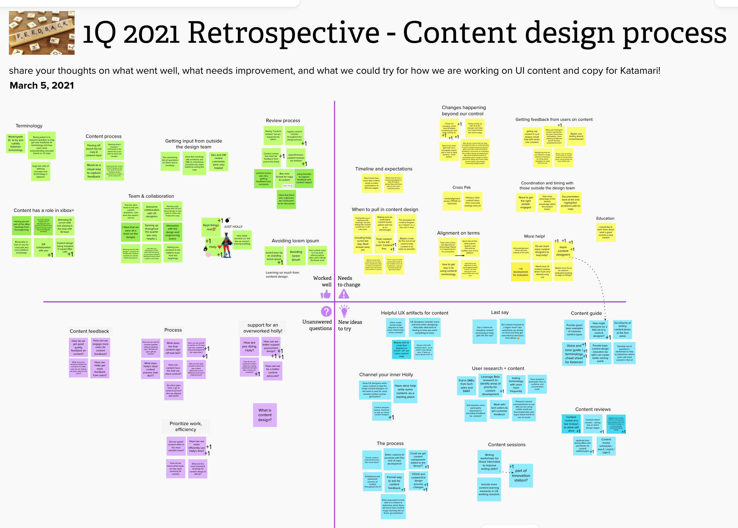Conducted a first-year retrospective to hear from the design team on how they felt the embedded UX content model was going. I got a lot of great input, ideas, and most special to me, support that what I was trying to do was helping them and improving our product experiences.